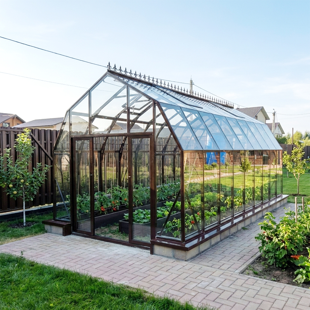 Красивая теплица CRISTALIKA Comfort с увеличенным объемом внутреннего пространства для размеров садовой теплицы. В качестве покрытия может использоваться закаленное стекло, которое, помимо собственной прочности, добавляет прочность и конструкции целиком, что в сочетании с достаточно жестким каркасом, делает эту теплицу пригодной для использования в любом регионе России без ограничений.